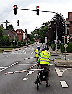 Mit "Poolnudel / Schwimmnudel" auf dem Gepäckträger zeigten wir deutlich sichtbar den Mindestabstand an. Wir fuhren vom Gymnasium Meckelfeld zwei Mal die Straßenzüge Seevetalstraße, Glüsinger Straße, Rönneburger Straße und zurück und bekamen überwiegend positives Echo von entgegenkommenden Autofahrer:innen. Die Polizei begleitete uns und bot an, dass wir bei Problemen sie sofort anrufen könnten.Doch das war nicht nötig.