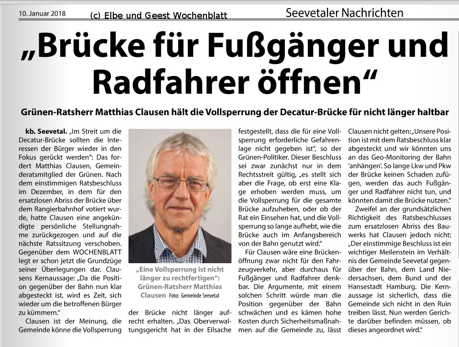 Unser Ratsherr Matthias Clausen unternimmt einen Vorstoß, die Decaturbrücke wenigstens für Fußgänger und Radfahrer zu öffnen - solange auch Bahn-Fahrzeuge einen Teil der Brücke nutzen dürfen.