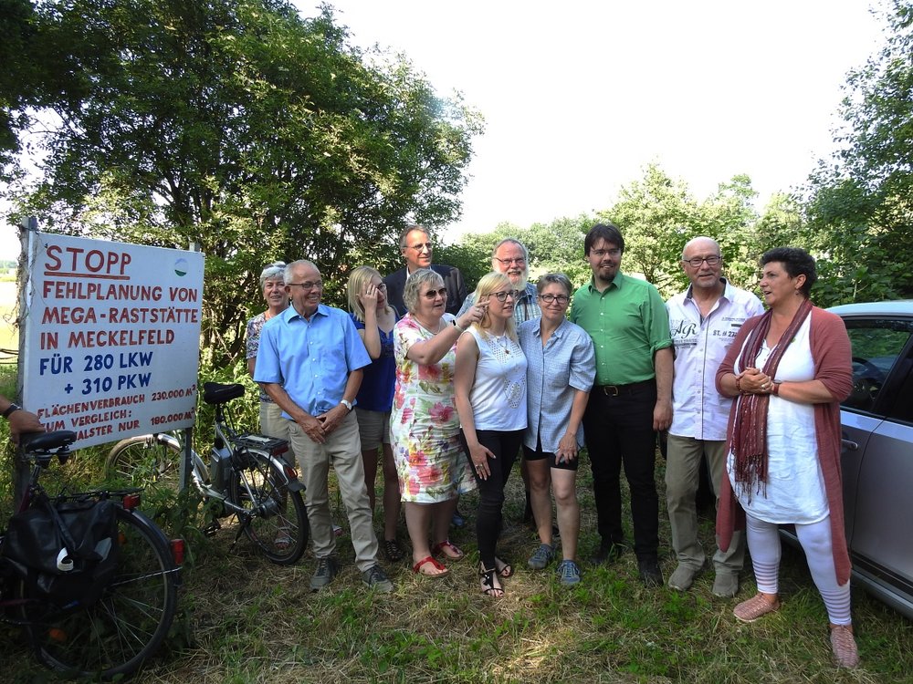 Am 7.6.2018 informierten sich 6 Abgeordnete der grünen Landtagsfraktion bei der BI gegen die Raststätte Elbmarsch vor Ort am Seevedeich in Meckelfeld.