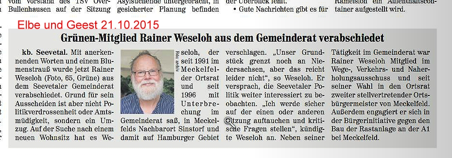 Umzugsbedingt muss Rainer Weseloh nach mehr als 30 Jahren politischer Tätigkeit seine Mandate und Ämter aufgeben. Da er jetzt in Hamburg-Sinstorf wohnt, kann er diese leider nicht mehr als Hamburger fortführen.