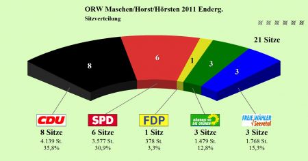 Grüne und SPD stellen zusammen mit den Freien Wählern 12 der 21 Ortsratssitze. CDU und FDP kommen mit 8 + 1 Sitz auf insgesamt 9 Sitze.