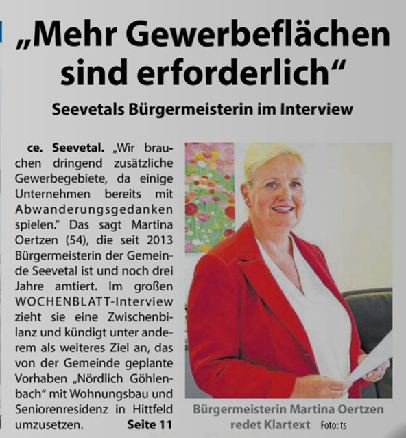 Unsere Bürgermeisterin Frau Oertzen spricht sich in einem Interview des Wochenblattes Elbe & Geest für mehr Gewerbegebiete in Seevetal aus.
