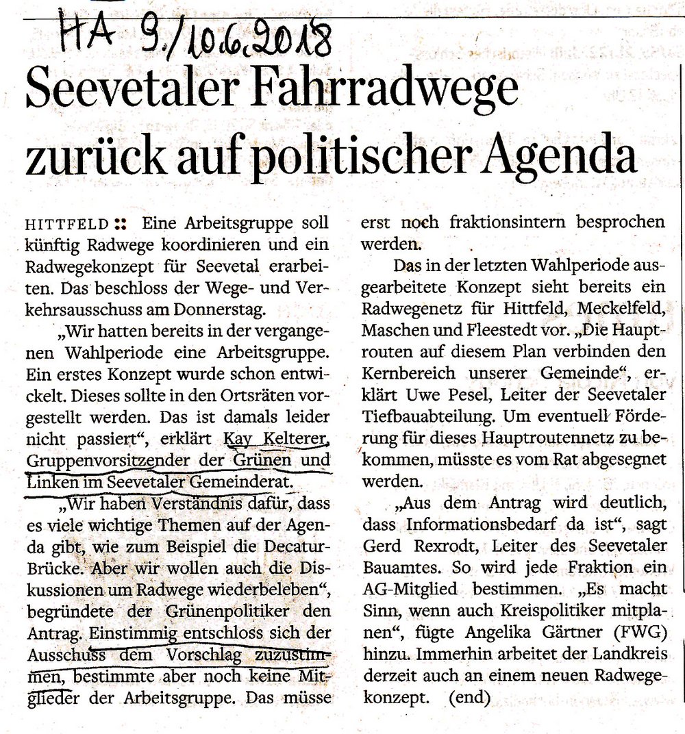 Nach jahrelanger Pause wurde auf unseren Antrag hin das Radverkehrskonzept Seevetal wieder im Wege- und Verkehrsausschuss beraten.