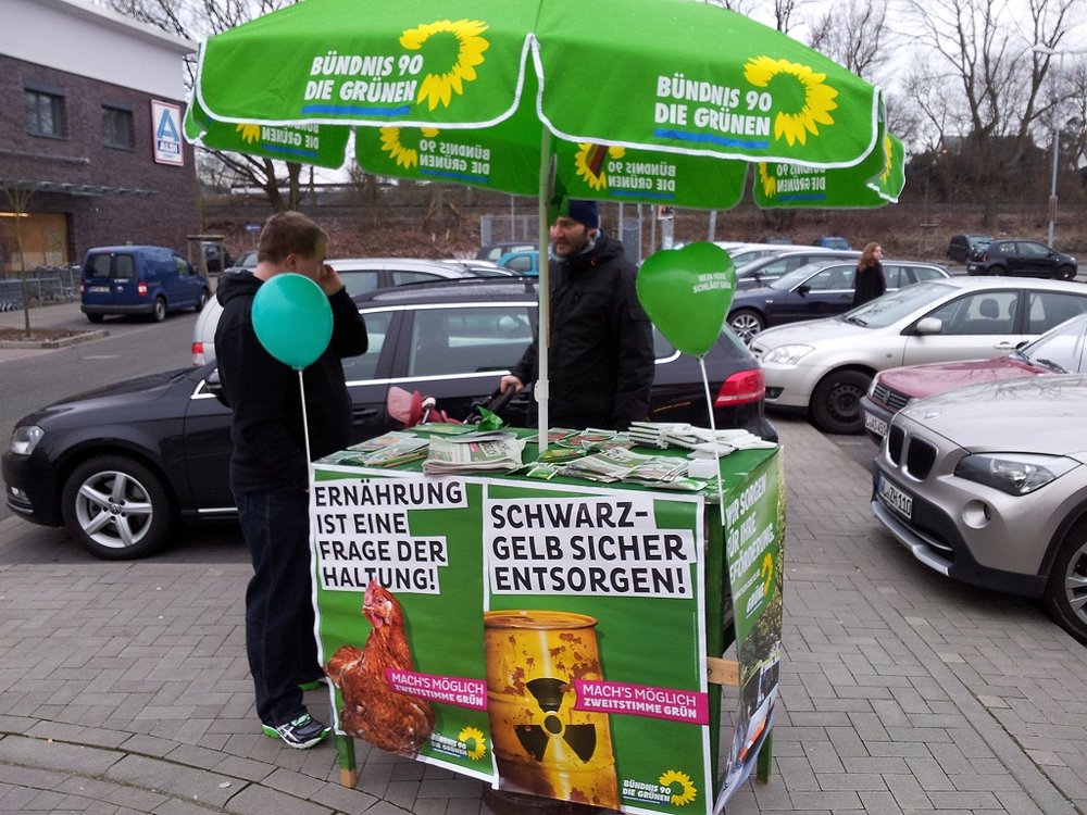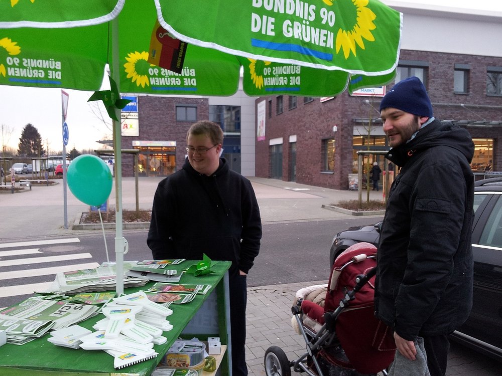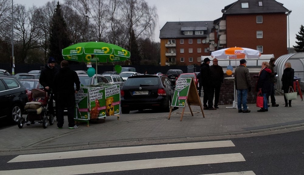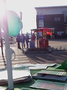 Zunächst begrüßten wir unsere Mitbewerber und guckten, welche giveaways sie für die Kundschaft auf dem Tisch hatten. Natürlich sprachen wir über die Bürgerinitiative gegen die Raststätte und versuchteen, den Wahlausgang am kommenden Sonntag einzuschätzen. Gespannt waren wir, ob sich die Piraten wieder zeigen würden, mit denen standen wir ganz allein am vergangenen Sonnabend an dieser Stelle.