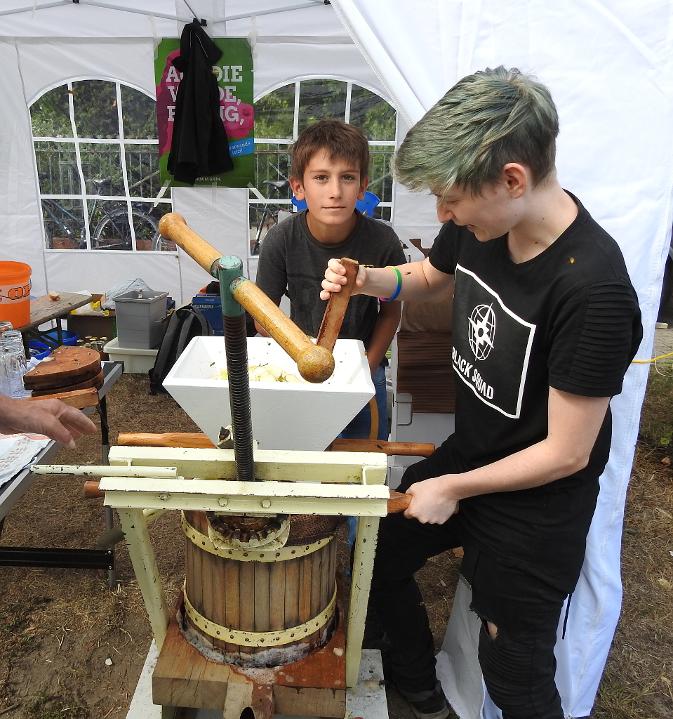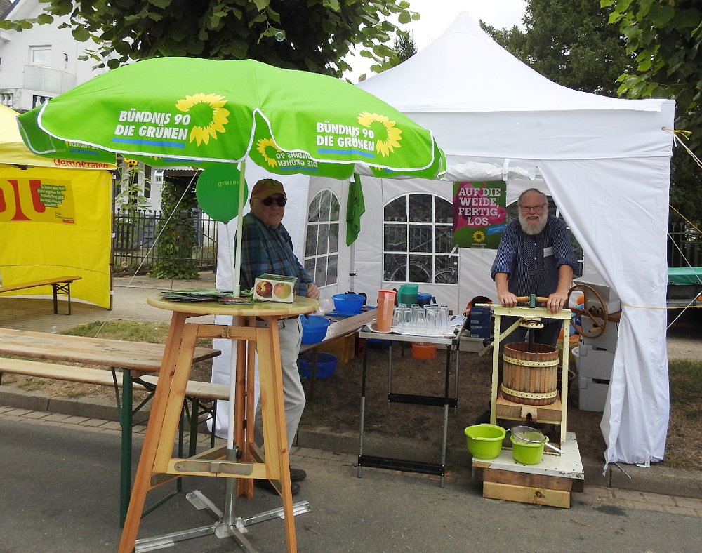 Insbesondere der Sonntagnachmittag lockte viele Besucher*innen zum Dorffest und an unserem Stand mit frisch gepressten Apfelsaft vorbei.